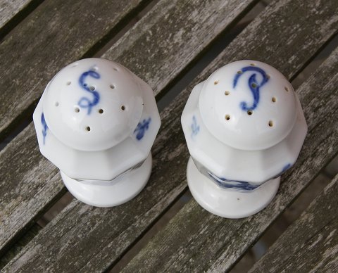 Blå Blomst Kantet Royal Copenhagen porcelæn spisestel. Kongelig porcelæn. Sæt salt- og peberbøsse i pæn stand H 8cm Lager: 1 sæt Emne nummer: po-Kantet sæt salt-peberbøsse